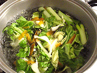 冷蔵庫の中の残った野菜を材料にして、さまざまなスープ料理のベースとなる“スープ・ストック”が簡単につくれます。野菜は、セロリの葉、ネギの青い部分、にんじんの皮、キャベツの芯、アスパラガスの硬い部分、各種ハーブ類の残りなどでOK。それぞれ適当な大きさに切ってよく洗ってから、水と一緒に鍋に入れて火をかけます。アクが出たら取りながら20~30分程度煮込み、野菜をこして出来上がり。スープ料理のベースになるほか、炒めものや洋風の煮物などに加えてもひと味違った仕上がりに!